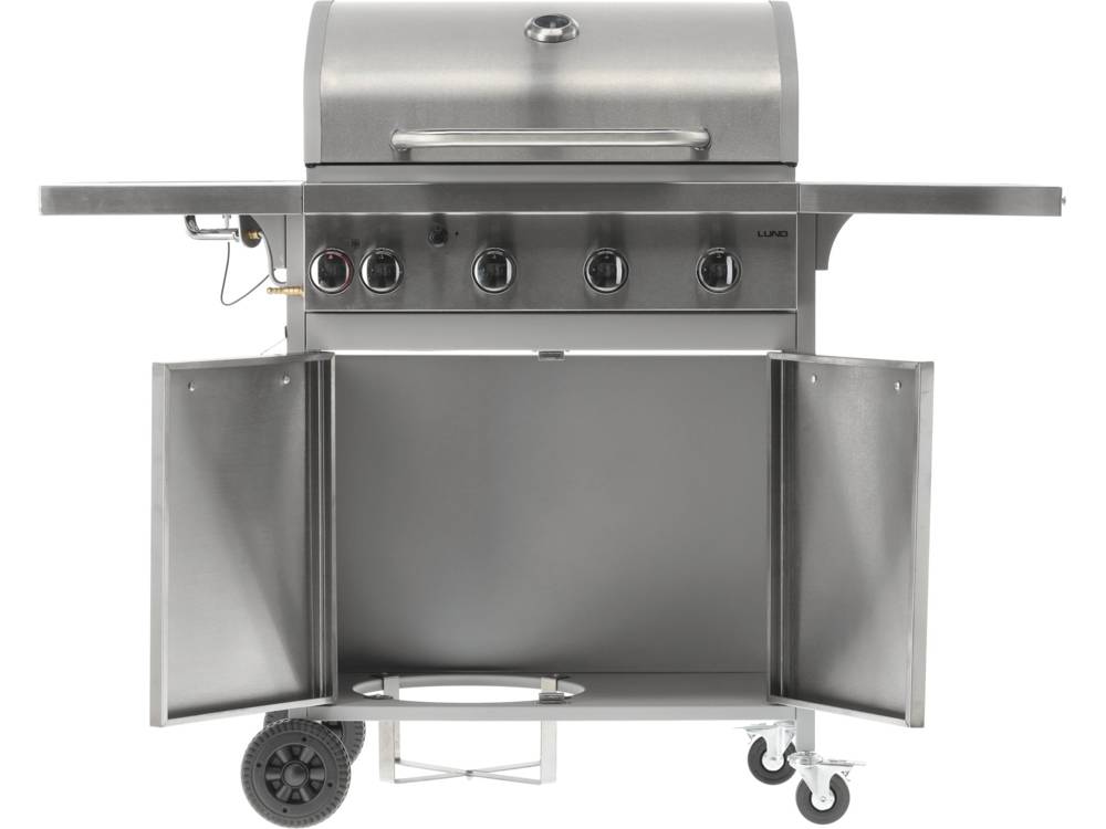 Grill gazowy marki LUND sprawdzi się zarówno w przydomowym ogrodzie czy na działce, jak i w branży gastronomicznej do przygotowywania grillowanych potraw na odbywających się na świeżym powietrzu imprezach plenerowych, festynach i jarmarkach. Grill wyposażony został w 4 palniki główne oraz dodatkowy palnik pomocniczy umieszczony w bocznej półce, który pozwoli na zagotowanie wody czy podgrzanie potrawy w garnku.