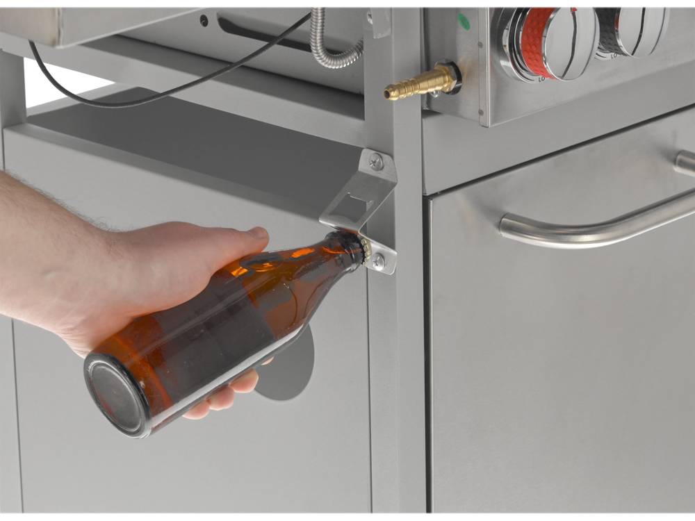 Po bokach znajdują się 2 dodatkowe półki. Wewnątrz jednej z nich umieszczono palnik do gotowania. Grill posiada wieszaki na akcesoria oraz otwieracz do butelek.