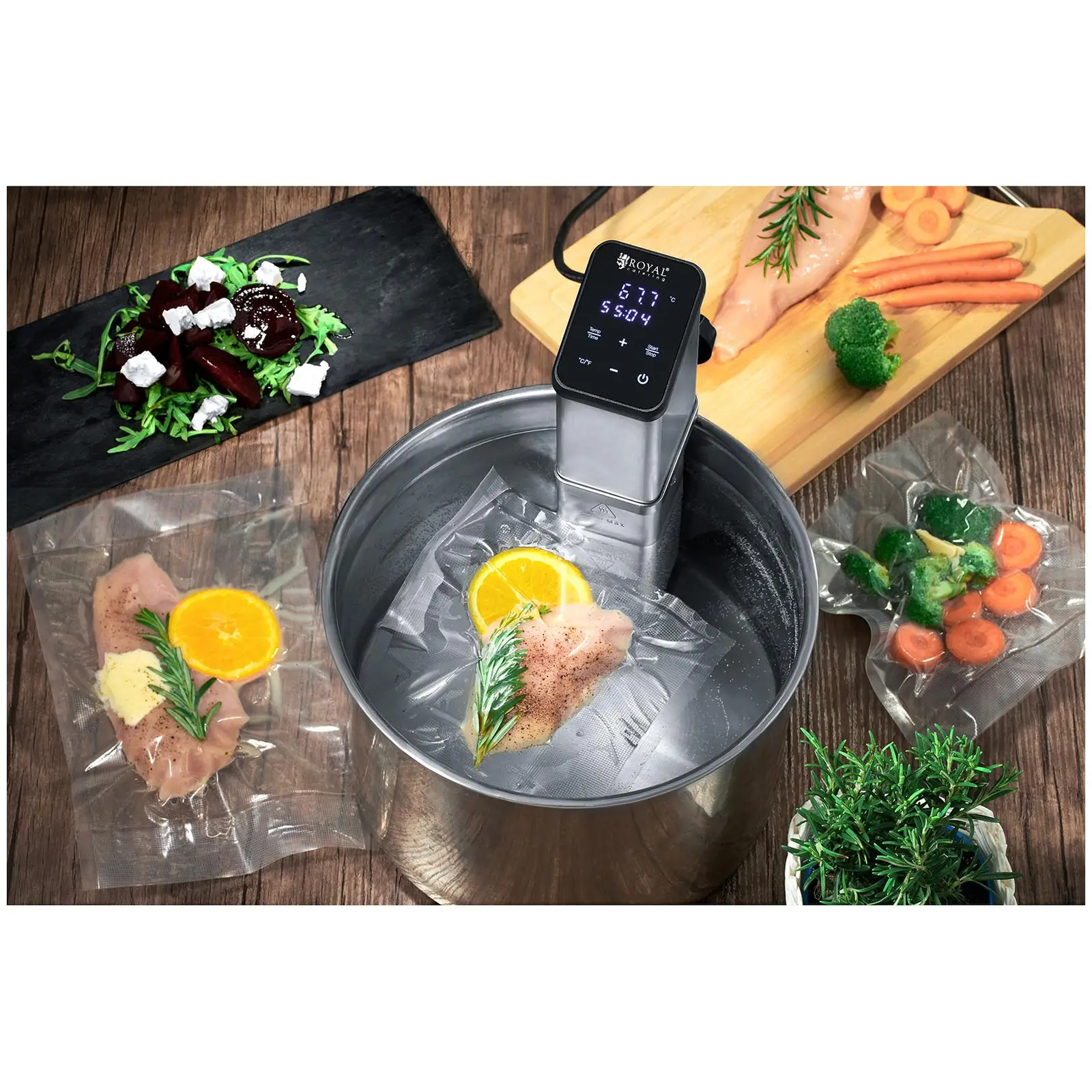 Urządzenie do gotowania sous vide marki Royal Catering to profesjonalny sprzęt przeznaczony do gotowania niskotemperaturowego. Sprawdzi się w nowoczesnych restauracjach oferujących dania kuchni molekularnej. Pozwoli na przygotowanie potraw w dowolnym bemarze lub garnku o pojemności użytkowej do 30 litrów. Dzięki niewielkim, kompaktowym wymiarom nadaje się również do użytku domowego. Urządzenie posiada certyfikat CE.