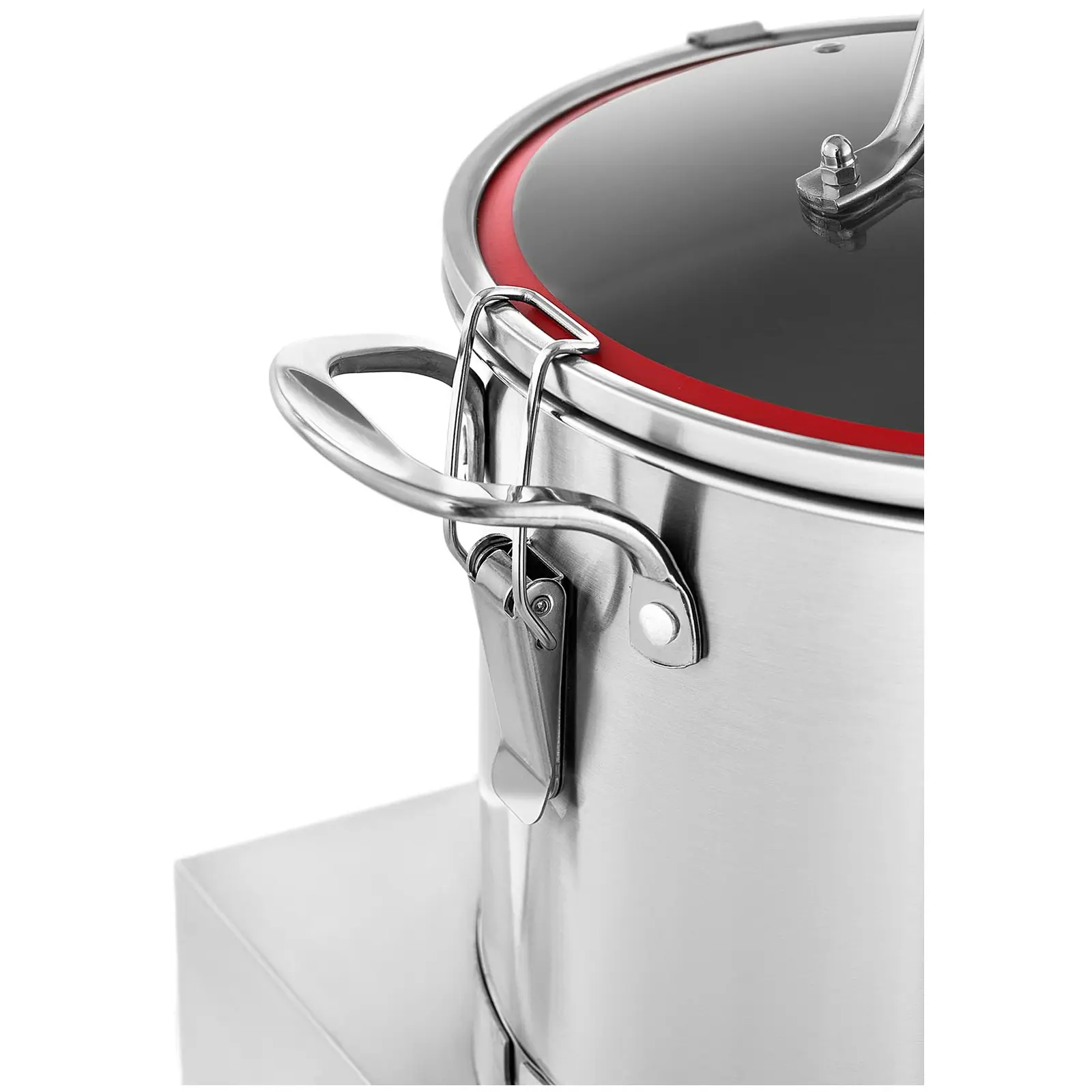 Zdejmowany garnek o pojemności 10 l posiada wygodne uchwyty boczne, które ułatwiają bezpieczny i komfortowy transport. Przezroczysta pokrywa z tworzywa sztucznego umożliwia kontrolę procesu cięcia.