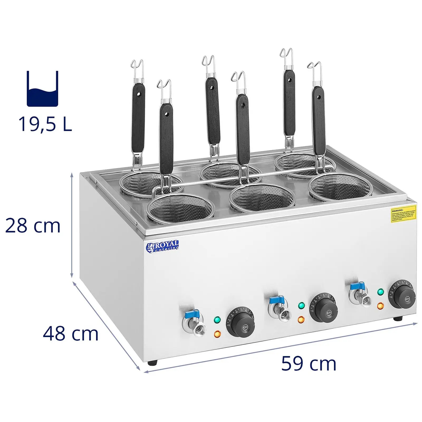 Warnik do makaronu marki Royal Catering umożliwi szybkie i łatwe ugotowania określonej ilości porcji makaronu. Świetnie sprawdzi się w barach szybkiej obsługi czy w restauracjach podających dania oparte o makarony: czy to spaghetti czy zupy, rosół itp. Urządzenie posiada certyfikat CE i spełnia wymagania Sanepidu.
