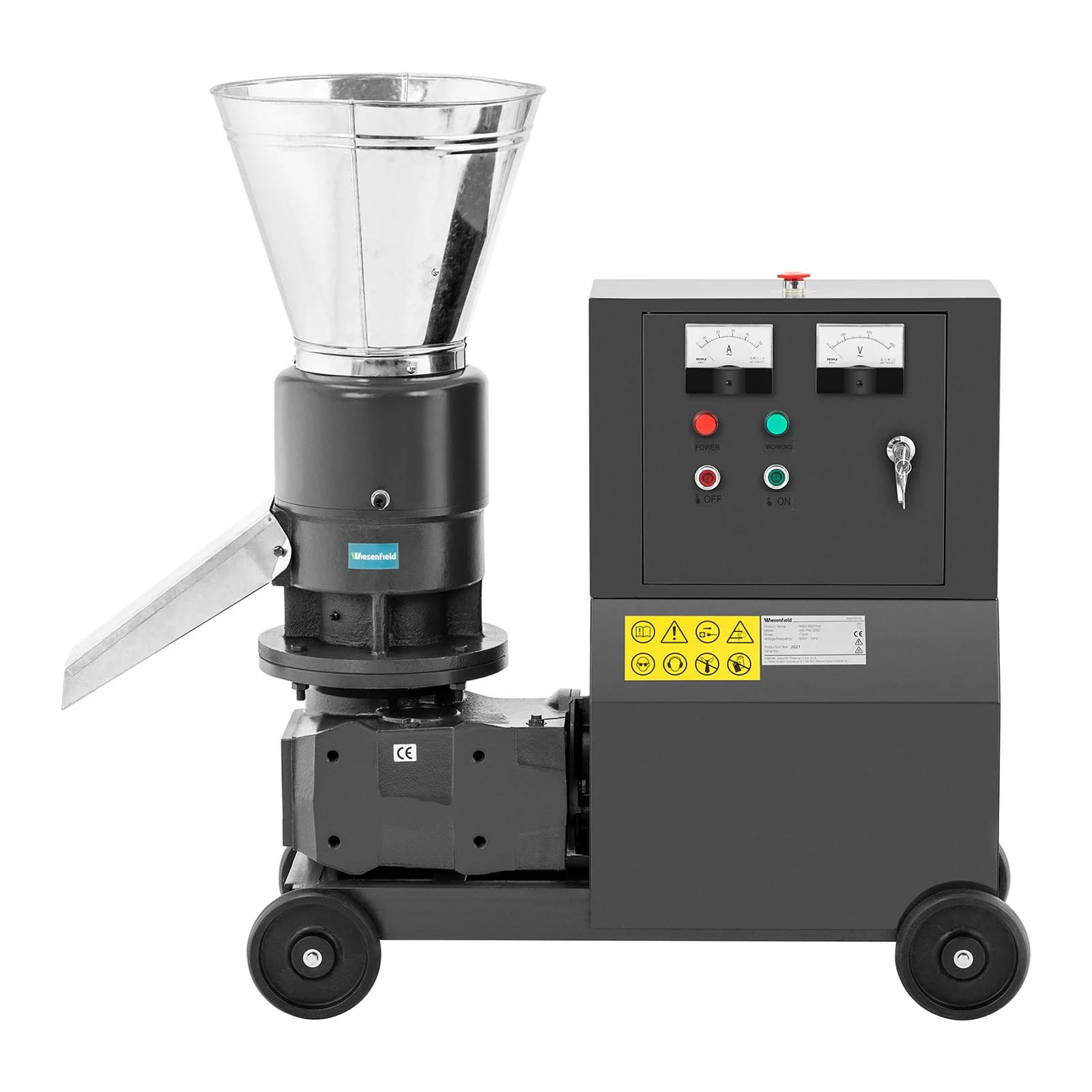 Trójfazowy silnik o mocy 7500 W pozwala na osiągnięcie ciśnienia i temperatury odpowiednich dla wytworzenia pelletu o idealnej konsystencji. Bezpieczeństwo pracy gwarantuje wyłącznik awaryjny.